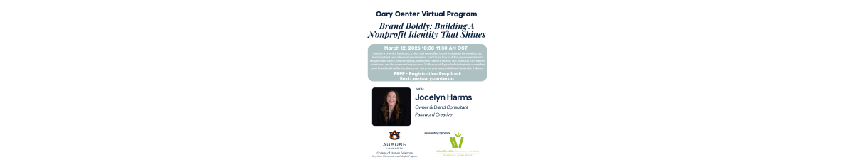 The Cary Center to Provide FREE Virtual Training for Nonprofits The Auburn University College of Human Sciences’ Cary Center for the Advancement of Philanthropy and Nonprofit Studies will feature Jocelyn Harms, Founder of Password Creative in its March virtual program titled “Brand Boldly: Building A Nonprofit Identity That Shines.”