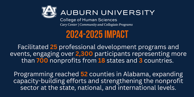 The Community and Collegiate division of the Cary Center provides capacity-building resources to nonprofits through educational programming, professional development, and networking opportunities. For more information, visit carycenter.auburn.edu or contact Brittany Spillman at spillbl@auburn.edu or 334-844-3557.