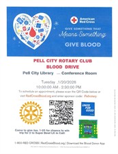 Please Join us for the Pell City Rotary Club 2026 Blood Drive on Tuesday, January 20th , from 10:00 AM – 2:30 PM in the Pell City Municipal Complex Building Conference Room